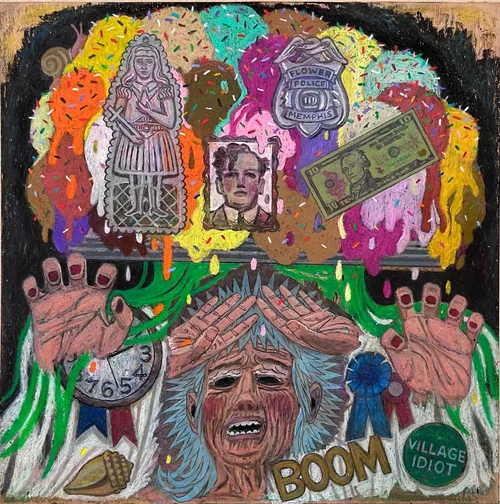 Dream Altar With Death Mask Of A Glam Rocker, 2021-22, oil pastel and prismacolor on board, 10 X 10 inches